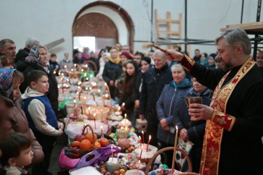Затем в строящемся Андреевском храме деревни Андреевское отец Дмитрий рассказал собравшимся жителям о празднике Пасхи, прочитал огласительное слово святителя Иоанна Златоуста и освятил принесенные пасхальные угощения.