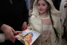 При входе все желающие могли молитвенно приложиться к чудотворной иконе Богородицы Умиление, привезённой на выставку из Свято-Успенского Псково-Печерского монастыря.